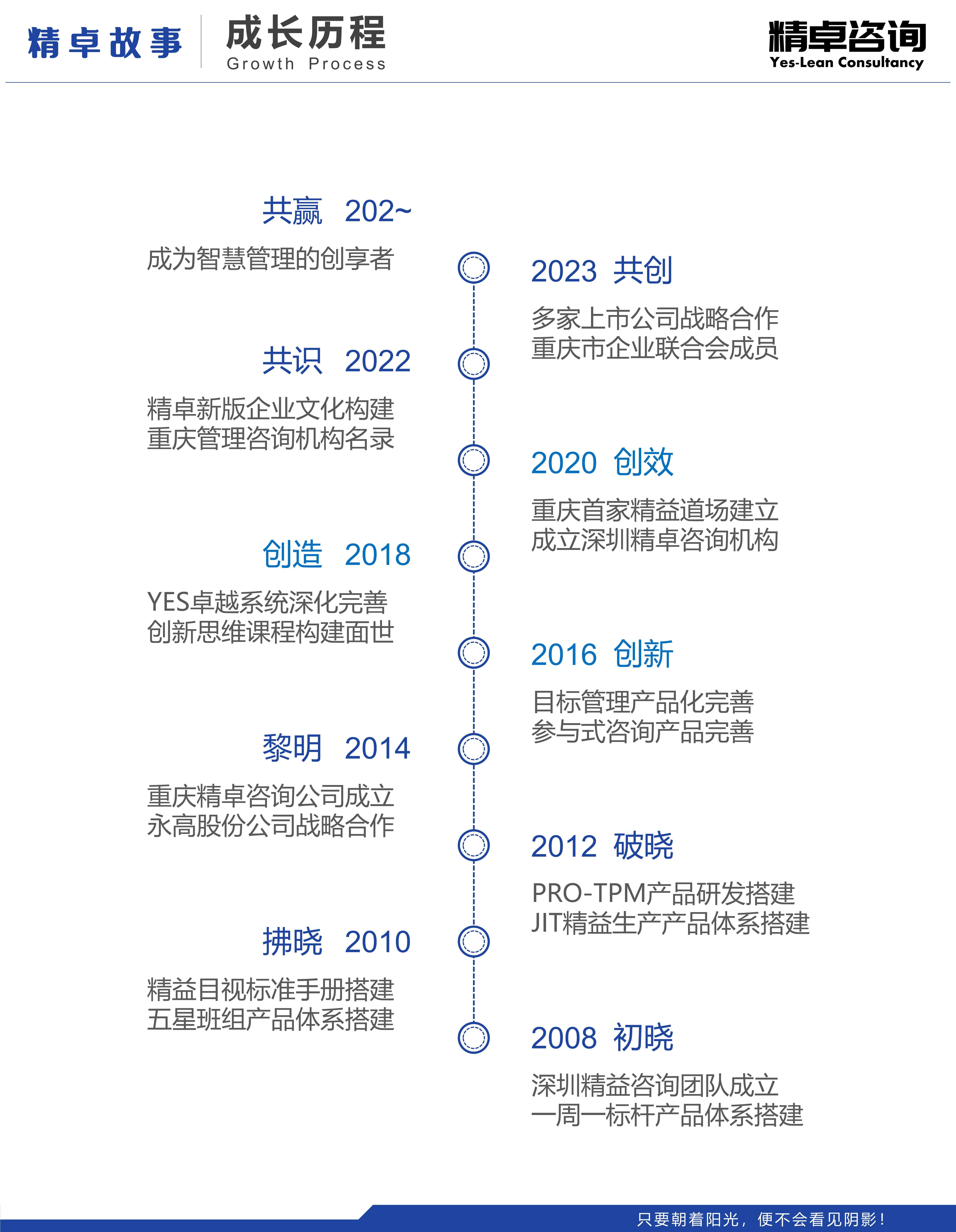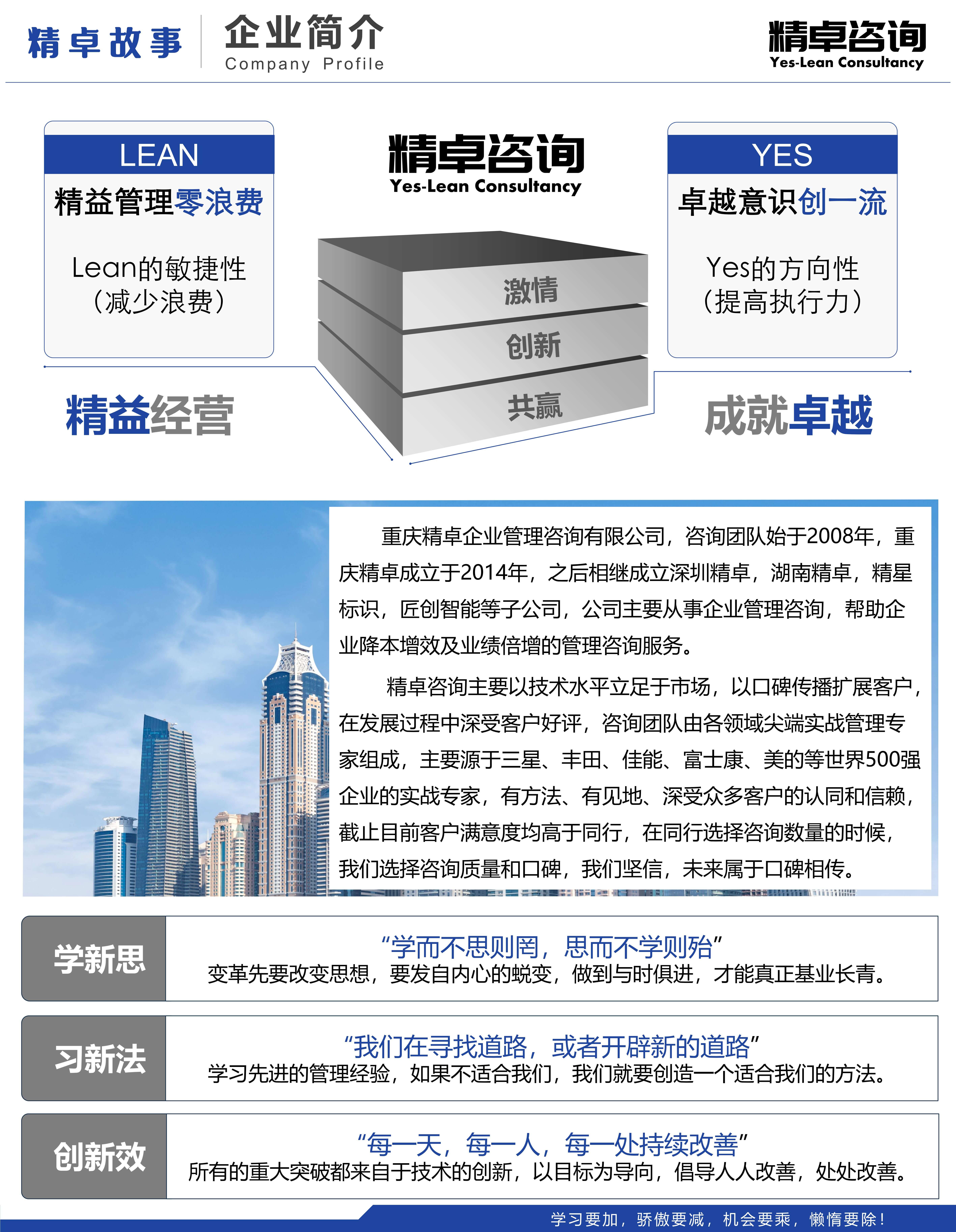 重慶精卓企業(yè)管理咨詢有限公司,是服務(wù)于全國企業(yè)管理轉(zhuǎn)型升級的咨詢服務(wù)公司,以“手把手落地式輔導(dǎo),承諾效果創(chuàng)造實效”的服務(wù)宗旨,專注于5S管理、6S管理、7S管理、TPM設(shè)備管理、精益生產(chǎn)管理、班組建設(shè)、目標(biāo)管理、一個流單元生產(chǎn)、PMC計劃物控、精益物流等領(lǐng)域的精益管理咨詢。我們結(jié)合中國企業(yè)實際,不斷進行創(chuàng)新與實踐,為企業(yè)量身定制精益管理整體解決方案。致力于幫助企業(yè)有效使用資源、改善流程、實現(xiàn)運營效益,為企業(yè)培養(yǎng)管理人才,協(xié)助企業(yè)跨越式發(fā)展并獲得持久競爭力。