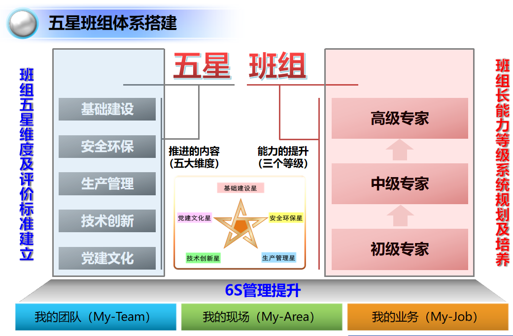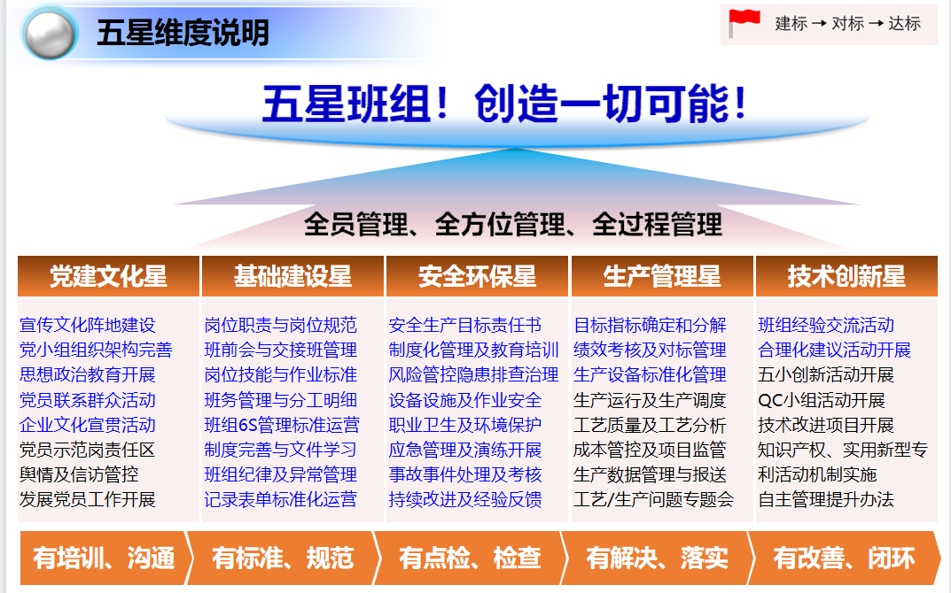 總結(jié)會(huì)首先由王燈喜老師從沽源鈾業(yè)精益管理規(guī)劃、第4期輔導(dǎo)工作說明、精益管理,理念分享等方面進(jìn)行針對(duì)性指導(dǎo),依據(jù)沽源鈾業(yè)班組此階段實(shí)際情況,結(jié)合目前推行的6S管理和安全標(biāo)準(zhǔn)化建設(shè)加上顧問在同行推進(jìn)班組建設(shè)的成熟經(jīng)驗(yàn),把工作中主要的內(nèi)容進(jìn)行再提煉形成新的五維模型,以每個(gè)維度建立評(píng)價(jià)基準(zhǔn)進(jìn)行管理,形成每年可循環(huán)管理的模式。